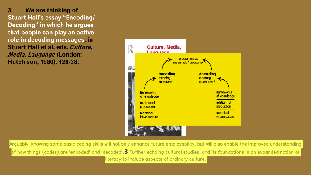 I’ve highlighted the end notes where I think they are adding to the argument and brought in some other references and also texts from other parts of the Aesthetic Programming book. In parts of the presentation I make my reasoning explicit, but not sure if that works or is needed. Also after making all this I have the feeling its just all too text heavy and that maybe the only thing I’ve done that helps push/show the text toward a new audience is to read it aloud… which I suppose at least has some slight access benefits