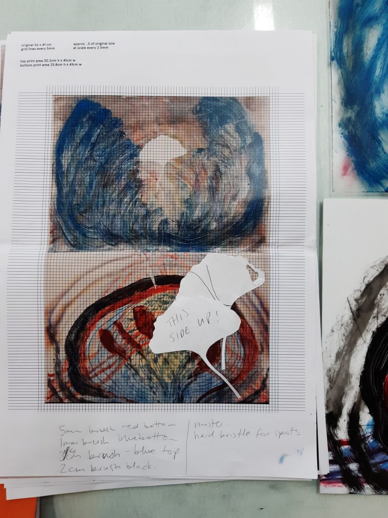The method I used involved printing out the artwork approximately to 1:1 scale, using a screen resolution image (so not very good quailty!). I split the image into the 2 separate prints which the artist has then sewn together.