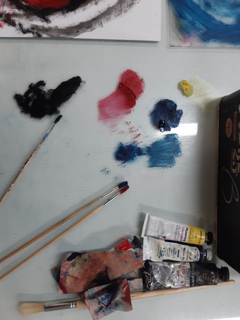 As I printed I found it unexpectedly difficult to forsee how a painted plate would print, something I have not experienced with other printing methods such as: Riso, digital, offset, letterpress or lino. This is obviously due to my lack of experience, but I suspect the element of surprise does not entirely disappear through practice. As I tried to mimic this artwork through compositional correctness (i.e. tracing it), the less it replicated the gestural tone of the work, which I found an interesting situation. From what I can tell this was due to the slowness of my brushstrokes when focused on accurate size and shapes, which meant the marks did not look as accurate in terms of fluidity of gesture or colour when printed.