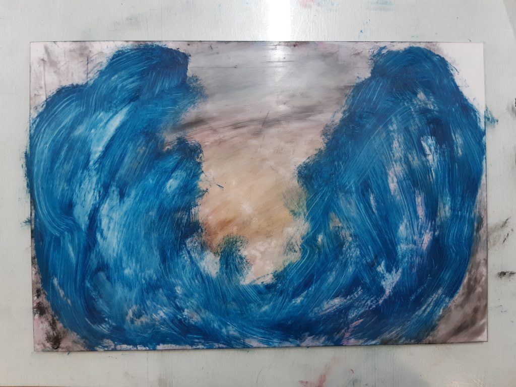 Whilst making these monoprints I found it hard to maintain a tight method, especially copying such a layered, gestural work. I use tight to mean: accurate, repeatable, accumulative or able to refine directly. I’m thinking of this in relation to my regular use of digital working files that can be versioned, reversed, pulled apart, made of discreet parts. Monoprinting in this painterly manner seems to work in opposition to this, rather than allowing me to refine a work as a retraceable set of actions it means each refinement of method produces a single, unalterable work. There is also a lack of mechanisation throughout the process, except for the pressure used on the press, which means there are a large number of manual controls which impact the print.