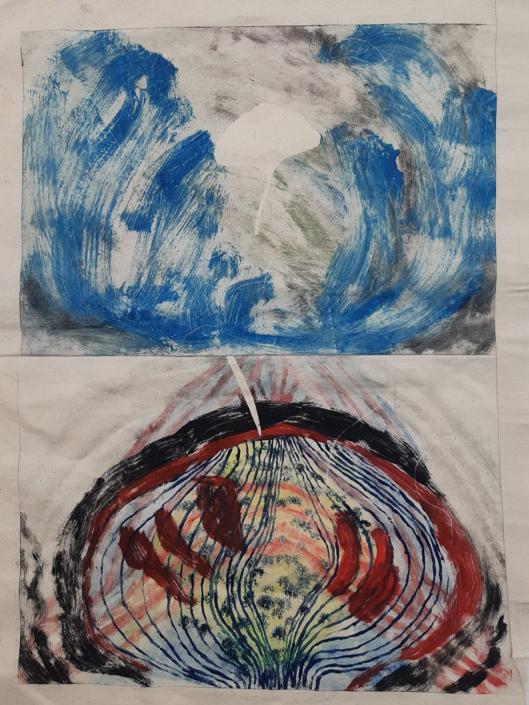There are certain aspects of the image I am copying that I have focused on trying to replicate and others which I have let slide to varying degrees and then reassessed my priorities between prints. For example I’ve focussed on resist of gingko, large folds and thread; direction of brushstrokes; placement of colours; size and shapes.
